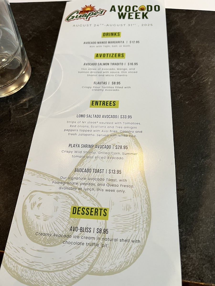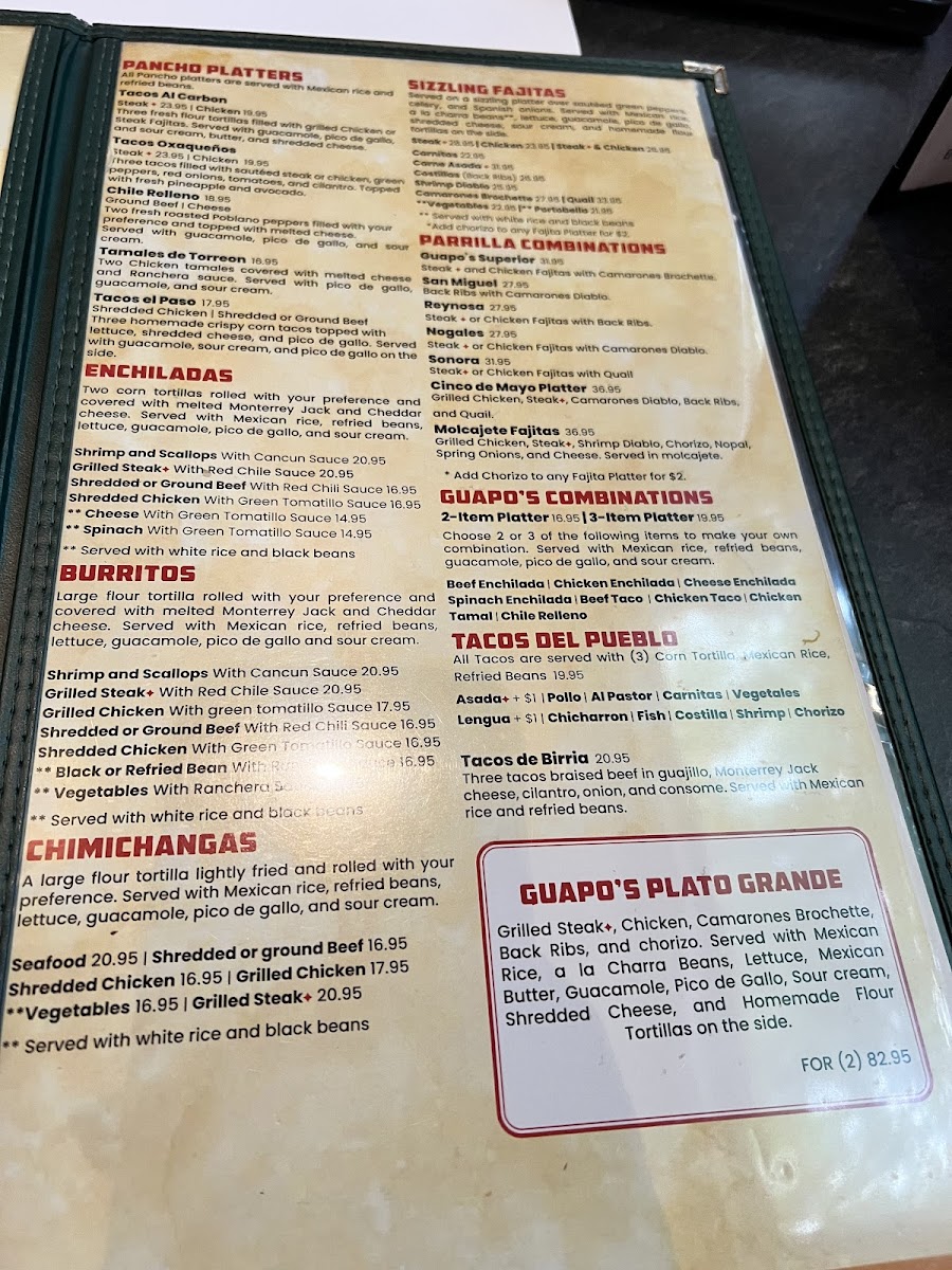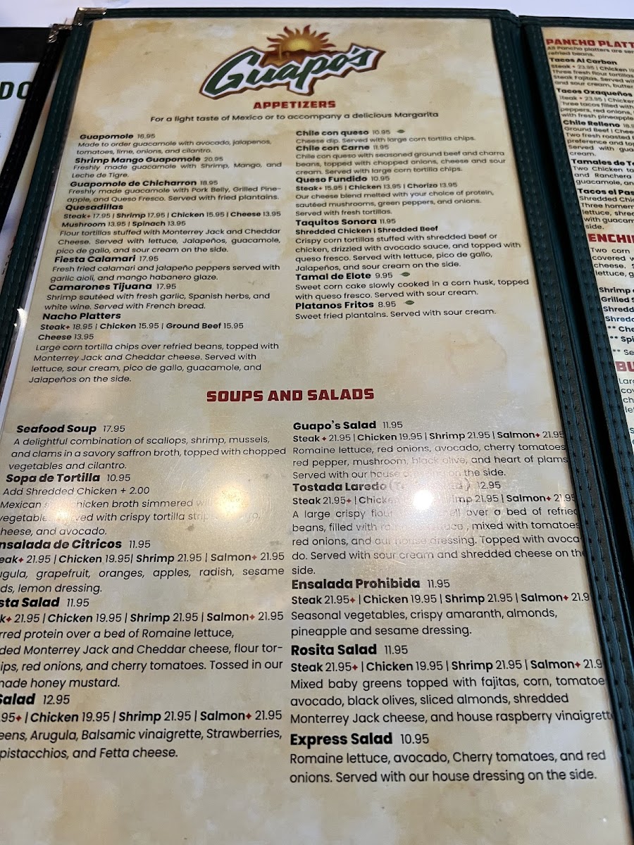 Of course, no meal is complete without a refreshing drink. Guapo's takes their margaritas seriously, serving up an array of flavors that perfectly complement the bold flavors of their dishes. Whether you prefer the classic Cadillac margarita or something a bit more adventurous, there's a cocktail awaiting you to wash down your meal with a smile.